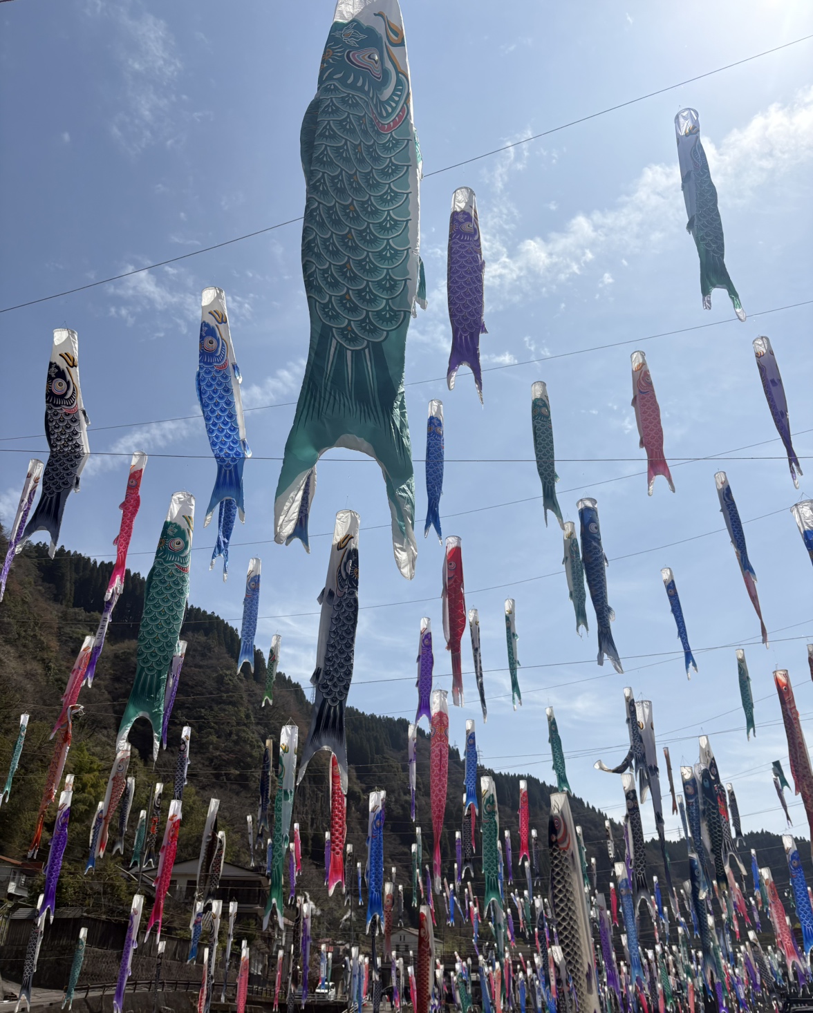 杖立川の上空を埋め尽くす大量の鯉のぼりは壮観な景色です!